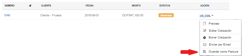 Lo primero es que la cotización debe tener un estatus Generada para poder guardarse como factura. Siendo así, siga los siguientes pasos:
