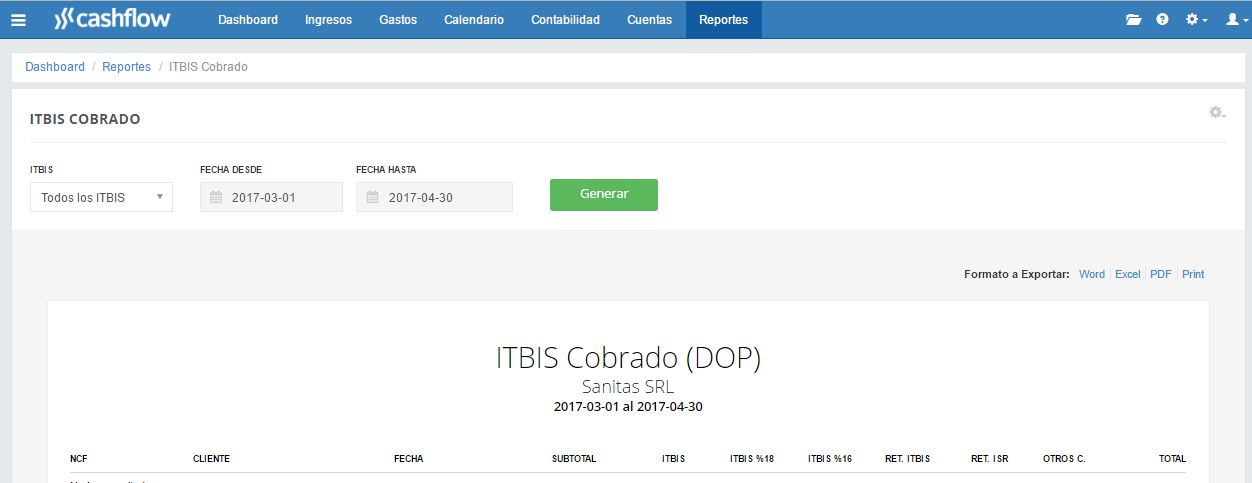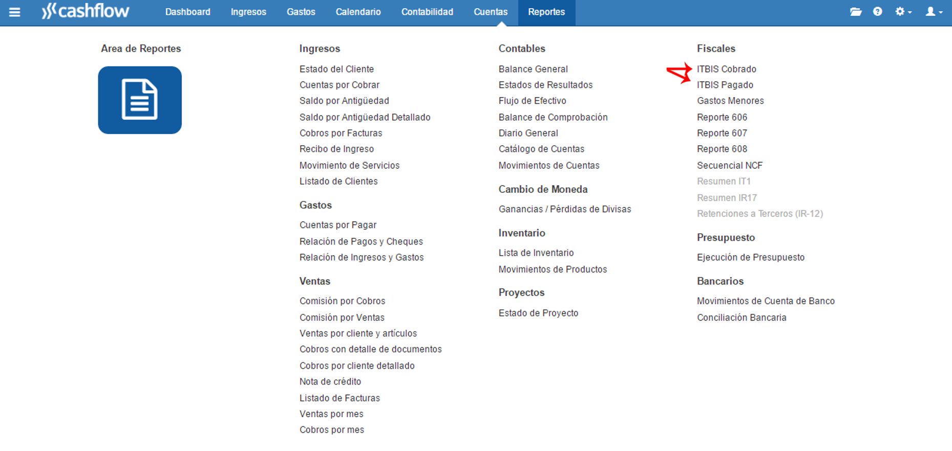 El Reporte de ITBIS Cobrado / Pagado; muestra un listado detallado de todos los ITBIS que se han cobrado y los ITBIS que se han pagado.